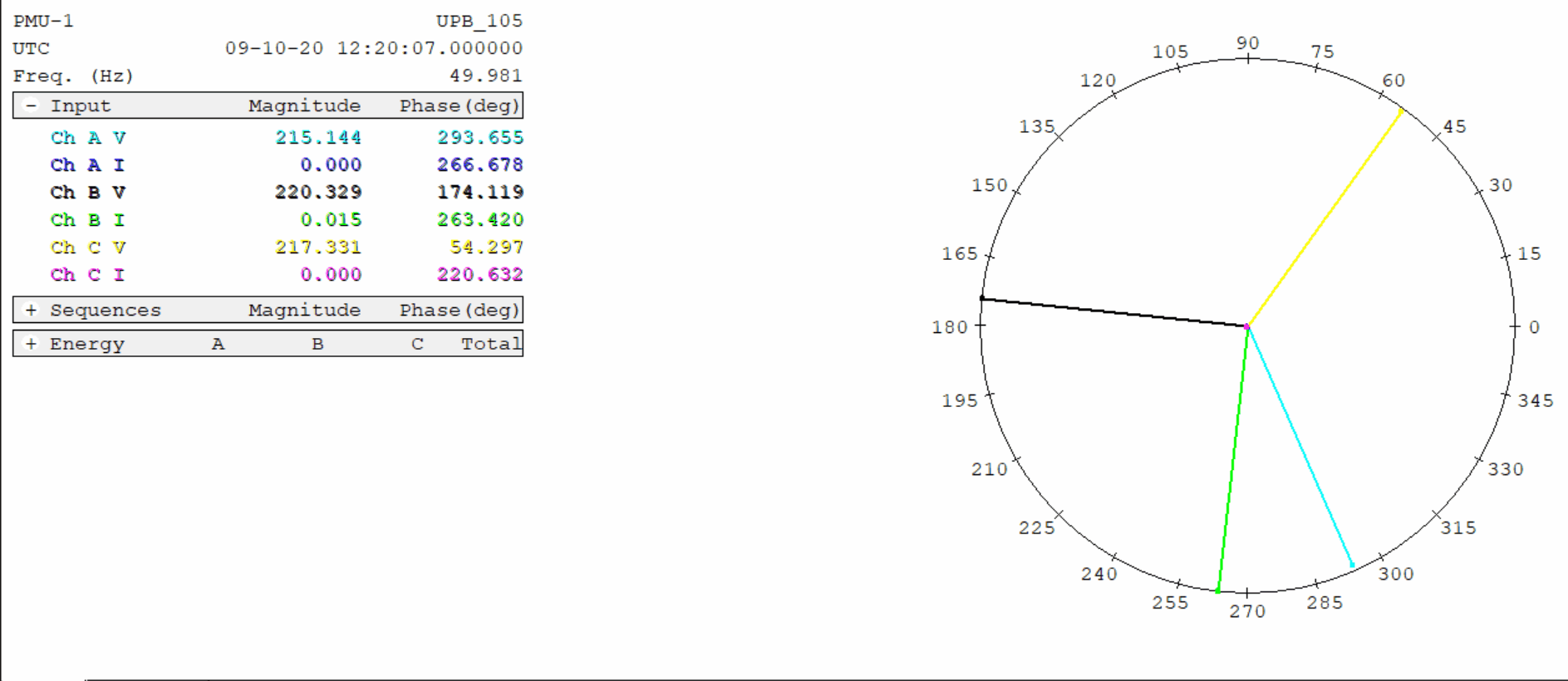 Phasor measurement units (PMUs) extract phasors (magnitude and phase angle) of the voltage and current signals in a power system, with all phase angles precisely referenced to a common time frame with the aid of the GPS. In addition to the phasor values, a PMU can estimate the frequency and the ROCOF of the measured signals. A PMU can be a stand-alone device or a functional unit within another physical unit such as power system digital fault recorder (DFR), protection relay,or a meter. The process of calculation of synchrophasors for a typical commercial PMU can be further anlyzed in [1]. The calculated phasors are combined to form positive sequence measurements, and time-tagged with the timing information.
