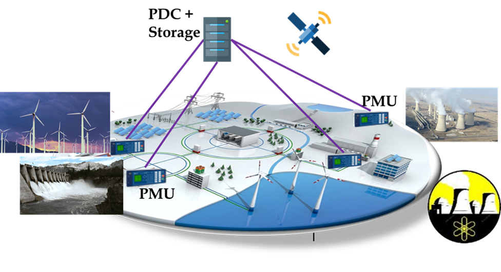 A typical architecture of a synchrophasor network is shown in the figure. PMUs produce synchronized measurements of the phasors, frequency, and the rate of change of frequency of the voltage and current signals, and output time stamped phasor data to a communication network using a standard format at a predefined reporting rate. PMUs are generally located in different substations of a power system. Time signals from the GPS are used to synchronize the phasor measurements to a common time base, as well as to time stamp the measurements. Synchrophasor measurements transmitted from PMUs at various locations of an interconnected power system are communicated to Phasor Data Concentrators (PDCs) over a wide area communication network. PDCs might be arranged in a hierarchical order. The role of a PDC is to collect, time align and send the synchrophasor data from PMUs to higher level PDCs. Data can be stored and use the time-aligned data for wide-area monitoring applications.