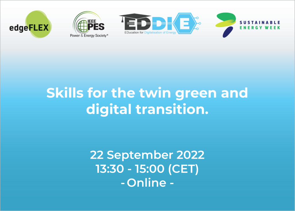 The session ”Skills for the twin green and digital transition” is part of the European Sustainable Energy Week – EUSEW 2022 Extended Programme, jointly organized by EDDIE Project – Education for Digitalisation of Energy, EdgeFLEX Project – Providing flexibility to the grid by enabling VPPs to offer fast dynamics control services, IEEE PES Task Force on Innovative Teaching Methods for Modern Power and Energy Systems, DG EMPL.B2, and DG ENER.