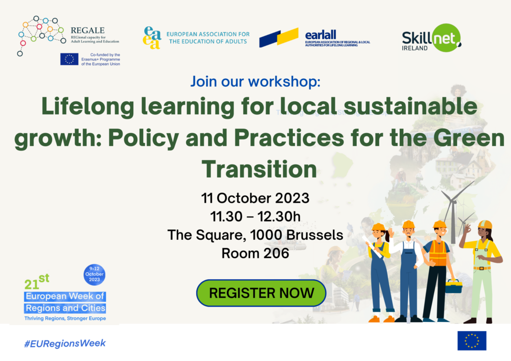 During the context of the Week of Regions and Cities, EARLALL, SkillNet Ireland and EAEA are pleased to announce this workshop. The workshop will propose an exchange on initiatives that empower local & regional authorities, businesses, and communities to develop the skills needed to achieve a carbon-neutral local economy. Participants will reflect upon a roadmap for building capacity in Adult Learning Education that was piloted in Europe in the context of the REGALE project, in addition to hearing from practices on building good public-private partnerships, including the example of Skillnet Ireland and Cork City.